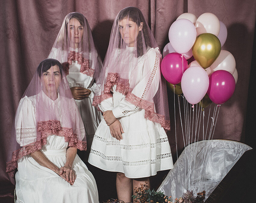 Però tornem a la vaporosa, intangiblement kitch i gairebé onírica funerària de Torns. Aquí, la Mort , com ja s’ha mort, es limita a restar tan silenciosa com qualsevol altre cadàver dins del seu taüt, mentre nosaltres li tributem un últim homenatge dempeus, i les germanes ens ofereixen la seva intensa interpretació de “La vall del riu vermell”, un tema que acostumava a no faltar mai en aquesta mena d’actes abans que s’imposés això d’incloure vídeos domèstics o àudios amb les cançons preferides del cadàver. Es tracta sens dubte d’una bona forma de començar el fantàstic funeral festiu que no esdevindrà veritablement festiu fins que arribi el tram final de l’espectacle. I és que per arribar a poder fer de la mort una festa, cal abans passar pel dol, assumir la presència dels fantasmes que s’han anat acumulant entre aquestes parets ara destinades a l’enderroc, i assumir alhora el feixuc pes específic d’aquells altres fantasmes personals molt estimats que sense adonar-se’n potser no t’han permès viure del tot com haguessin volgut viure ni ser-ne conscient d’això. I cal també saber desaparèixer o fer veure que es desapareix , per tal de permetre que s’alliberi de la teva presencia qui necessita fer-ho a l’hora d’encarar-se a viure realment: seria una trista gràcia que ara que la Mort s’ha mort, les persones seguissin vivint com si estiguessin mortes! I és a l’hora d’enfrontar-se a totes aquestes circumstàncies un cop finalitzat el funeral inicial, quan el text de Torns mostra les seves limitacions. L’autor de “Distància”, o d’aquella altra “Hàbitat (doble penetració) “guanyadora de la beca DespertaLab 2018 engega motors partint d’una força bona idea plena de possibilitats. Però , malgrat el molt eixerit treball interpretatiu de les seves tres protagonistes ( Laura Daza, Rosa Vila, Clara de Ramon), i malgrat que allò que es diu o es fa a l’escenari mai està del tot desproveït d’interès, el cert és que massa sovint et transmet també la sensació d’anar una mica perdut; d’haver-se quedat ancorat en l’idea inicial sense haver-la sabut desenvolupar del tot. Les nostres tres enterramorts se’ns presenten com a caràcters un xic desdibuixats , personatges en excés reiteratius i mancats de densitat , massa plans com a per a poder aconseguir que la dramatúrgia assoleixi els objectius d’un text que, en paraules de Torns, està escrit amb la intenció d’anar a la contra de la sensació d’apocalipsi imminent que ens envaeix tot sovint. Així les coses la festa funerària es queda lluny de resultar fantàstica, encara que resulti fantàstic creure per una estona que ens hem lliurat de la Mort.