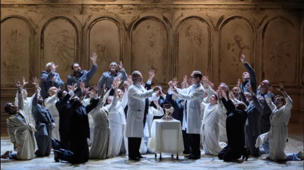 La proposta de Guth situa l’acció de Parsifal en una Alemanya desolada després de la Primera Guerra Mundial on els cavallers custodien el Sant Graal en un hospital per a mutilats de guerra. És la imatge de la humanitat tocada i enfonsada que es reflecteix en la ferida d’Amfortas que mai para de sagnar. He de reconèixer que, al principi, aquesta idea em feia aigües per tot arreu, però, després de reflexionar sobre el tema, he arribat a la conclusió que la producció de Guth és senzillament una obra mestra on es rellegeix la història del babau innocent que acaba convertit en rei. Els habitants d’aquest hospital són els supervivents d’un món de mort, d’un món decadent que espera l’arribada d’un nou salvador i Guth, amb això, el que fa és actualitzar el mite i advertir sobre els falsos redemptors. La humanitat convalescent es veu amenaçada per una figura redemptora que, de fet, pot endur-se-la cap a una devastació encara més gran i cap a la barbàrie total. El jove Parsifal que arriba per instruir la humanitat és vist com una paràfrasi de Hitler quan és ungit com el nou líder del Graal. Al final del muntatge, Guth adverteix de l’arribada del nazisme a Alemanya com a resultat de les ferides provocades per la Primera Guerra Mundial. En aquest moment, Kundry marxa cap a l’exili amb una sola maleta com a presagi de l’arribada del totalitarisme que encarna, en aquest cas, la figura de Parsifal. Un detall que potser va passar desapercebut enmig d’aquesta colossal obra, però que va ser bastant encertat, va ser la tornada de Klingsor ‘a casa’ un cop Titurel mor. Gairebé mai es mostra aquesta part més humana del cavaller caigut i que aquí veiem gràcies al fet que Guth indaga en la profunditat psicològica dels personatges. L’única escenografia giratòria que es troba sobre l’escenari és un encert perquè crea espais diferents i aporta un gran dinamisme a una òpera que es pot acostar a l’estatisme.